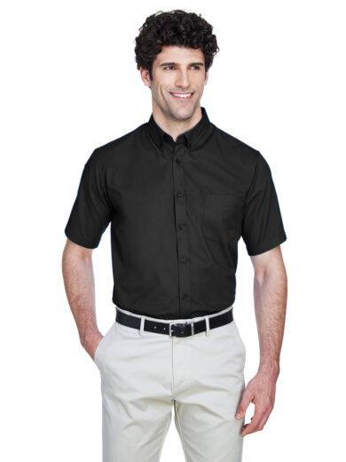 3.4 oz., 55% cotton, 45% polyester; Fine yarn count shirting; True Non-iron performance straight from the dryer; stain release finish; Active Fit; Patented pucker-free taped seams; Fused collar, cuffs, and placket; Split back seam with bias cut back yoke;