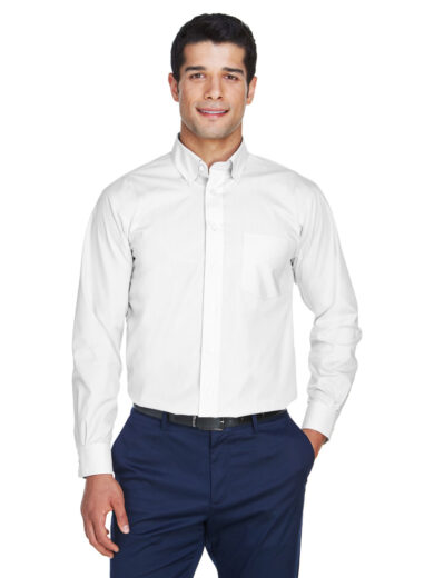 3.4 oz., 55% cotton, 45% polyester; Fine yarn count shirting; True Non-iron performance straight from the dryer; stain release finish; Patented pucker-free taped seams; Fused collar cuffs and placket; Split back seam with bias cut back yoke; pearlized but